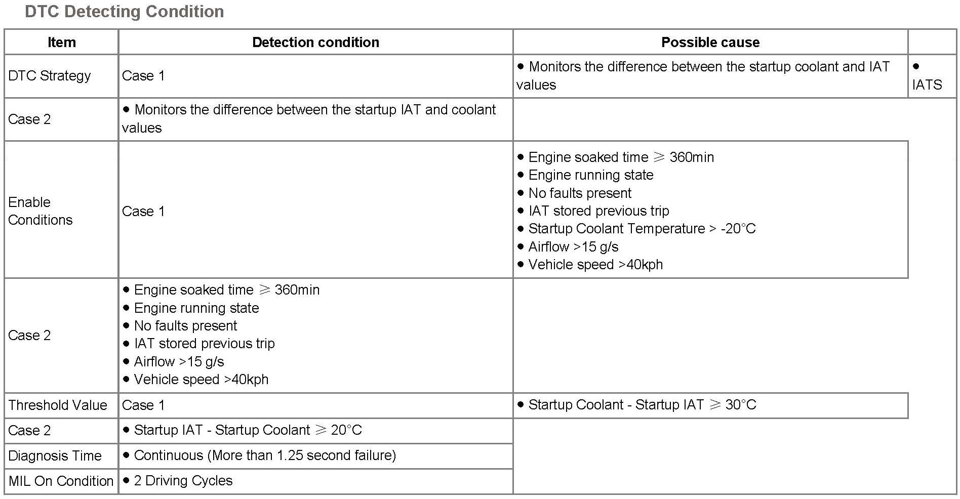 ECM monitors temperature changes resulting from soaking the vehicle. Therefore, Coolant temperature and Intake temperature should be changed. If ECM detects intake air temperature correlated to coolant temperature does not change ECM determines that a fault exists and a DTC is stored. MIL (Malfunction Indication Lamp) turns on when the malfunction lasts till consecutive 2 driving cycle.