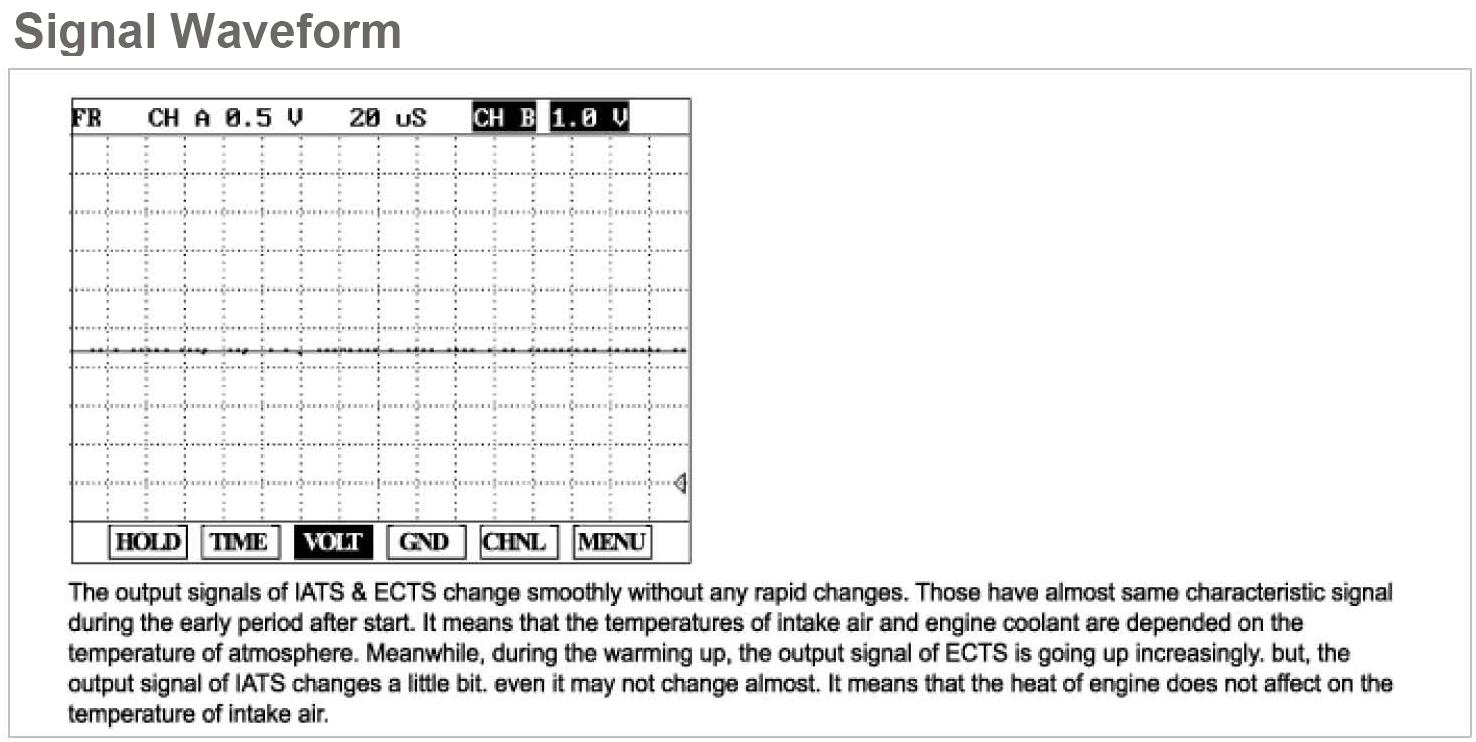 When the resistance value of the thermistor in IATS changes according to the intake air temperature, the signal voltage also changes. Using this signal, the information of the intake air temperature, the ECM corrects basic fuel injection duration and ignition timing.