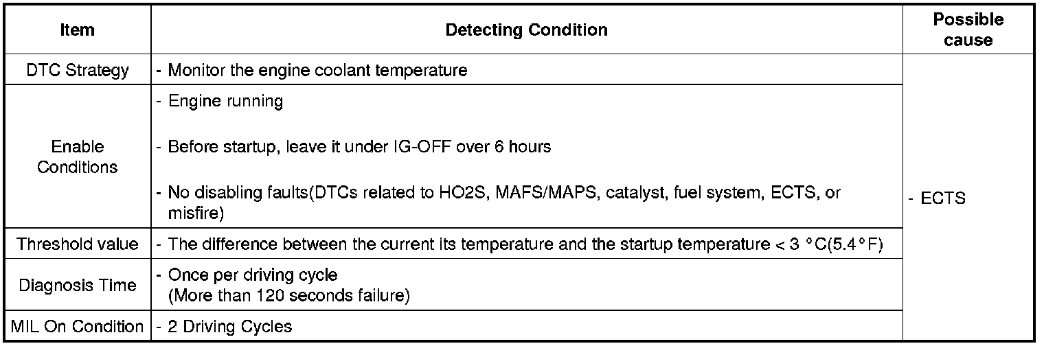Checking the engine coolant temperature under detecting condition, if if the difference between its current temperature and start-up temperature is less than threshold value over predetermined period, ECM sets P0115. MIL(Malfunction Indication Lamp) turns on when the malfunction lasts till consecutive 2 driving cycle.