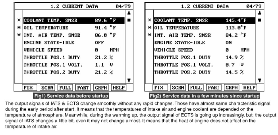 The Engine Coolant Temperature Sensor (ECTS) is located in the engine coolant passage of the cylinder head for detecting the engine coolant temperature. The ECTS uses a thermistor whose resistance changes with the temperature. The electrical resistance of the ECTS decreases as the temperature increases, and increases as the temperature decreases. The reference 5 V in the ECM is supplied to the ECTS via a resistor in the ECM. That is, the resistor in the ECM and the thermistor in the ECTS are connected in series. When the resistance value of the thermistor in the ECTS changes according to the engine coolant temperature, the output voltage also changes. During cold engine operation the ECM increases the fuel injection duration and controls the ignition timing using the information of engine coolant temperature to avoid engine stalling and improve drivability.