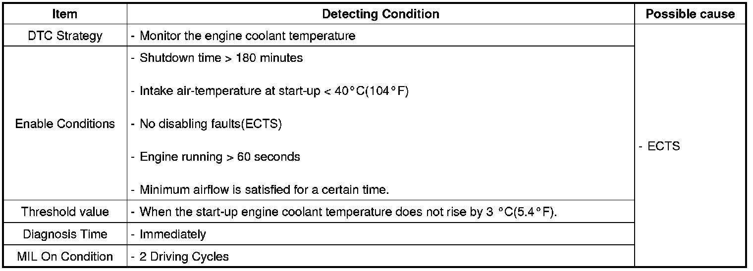 If the ECT signal is stuck above the lowest enabling temperature value, P0116 is set. MIL(Malfunction Indication Lamp) turns on when the malfunction lasts till consecutive 2 driving cycle.
