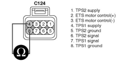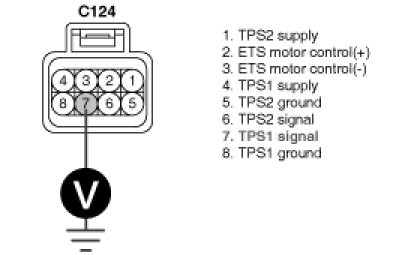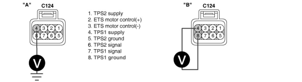 4. Measure voltage between terminals 4 and 8 of TPS harness connector.