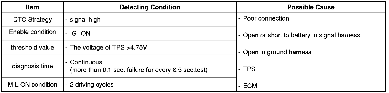 Checking output signals from TPS1 every 8.5 sec. under detecting condition, if an output signal is above 4.75V for more than 0.1 sec., ECM sets P0123. MIL(Malfunction Indication Lamp) turns on when the malfunction lasts till consecutive 2 driving cycle.