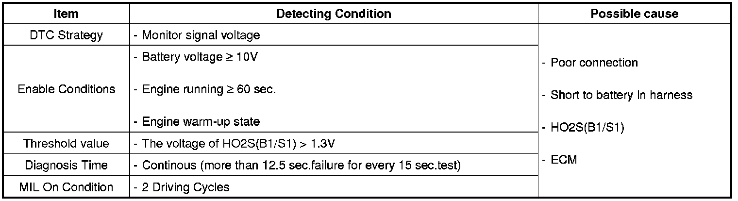Checking output signals from HO2S under detecting condition, if an output signal is above 1.3V for more than predetermined time, ECM sets P0132. MIL(Malfunction Indication Lamp) turns on when the malfunction lasts till consecutive 2 driving cycle.