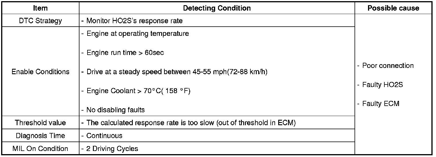 Checking output signals from HO2S under detecting condition, if ECM judges it's signals too slow, ECM sets P0133. MIL(Malfunction Indication Lamp) turns on when the malfunction lasts till consecutive 2 driving cycle.