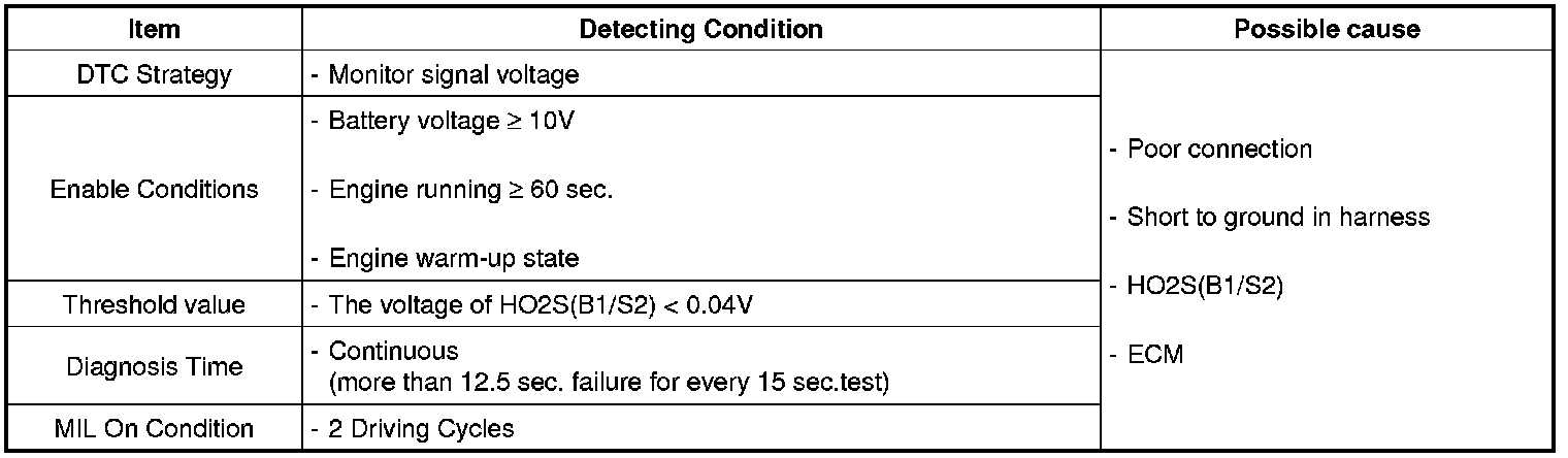 Checking output signals from HO2S under detecting condition, if an output signal is below 0.04V for more than predetermined time, ECM sets P0137. MIL(Malfunction Indication Lamp) turns on when the malfunction lasts till consecutive 2 driving cycle.