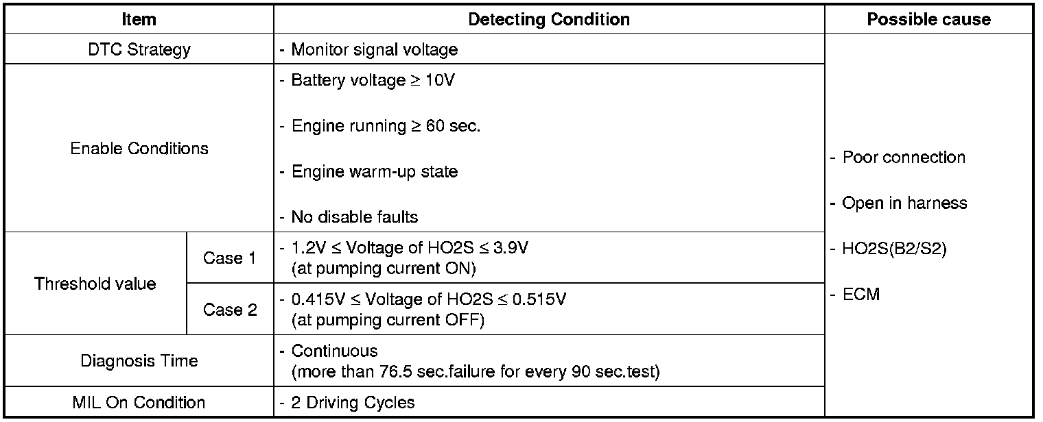 Checking output signals from HO2S under detecting condition, if an output voltage is approx.0.45V or 3.5V for more than predetermined time, ECM sets P0160. MIL(Malfunction Indication Lamp) turns on when the malfunction lasts till consecutive 2 driving cycle.