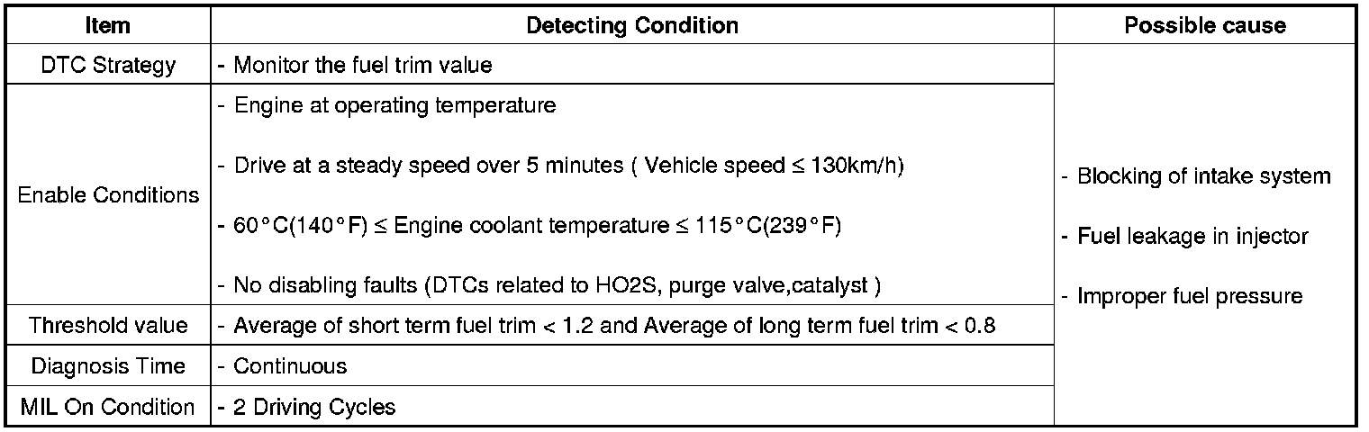 Checking the fuel trim value under detecting condition, if its average exceeds the limit over certain period, ECM sets P0175. MIL(Malfunction Indication Lamp) turns on when the malfunction lasts till consecutive 2 driving cycle.