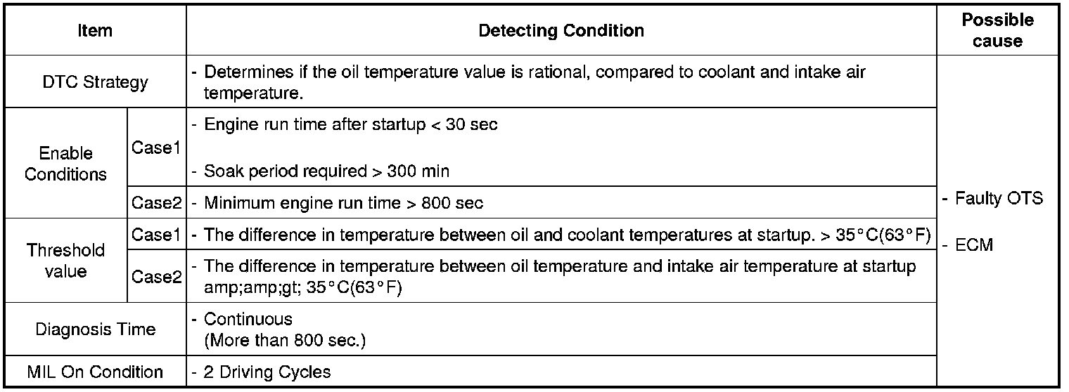 Checking the oil temperature , coolant temperature and intake air temperature every 25 sec. under detecting condition, if the difference in temperature at start-up exceeds threshold value, ECM sets P0196. MIL(Malfunction Indication Lamp) turns on when the malfunction lasts till consecutive 2 driving cycle.