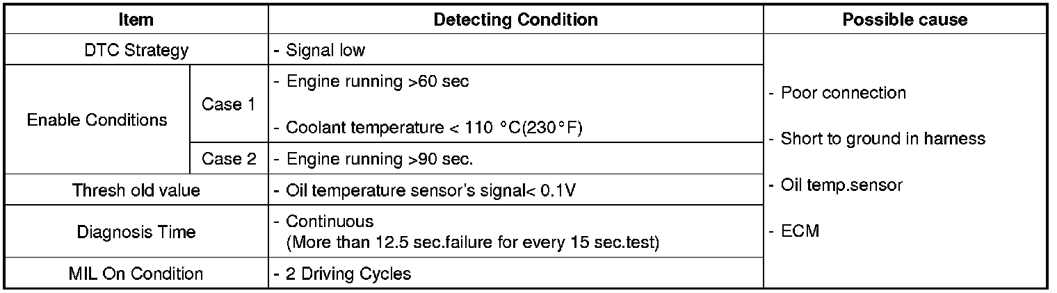 Checking output signals from oil temperature sensor every 15 sec. under detecting condition, if an signal is low for more than 12.5 sec., ECM sets P0197. MIL(Malfunction Indication Lamp) turns on when the malfunction lasts till consecutive 2 driving cycle.