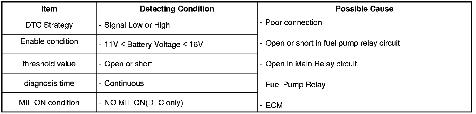 Checking fuel pump relay circuit continuously under detecting condition, if open or short in the circuit is detected, ECM sets P0230.In addition, Take note that open circuit in Main Relay may cause this P0230 code.