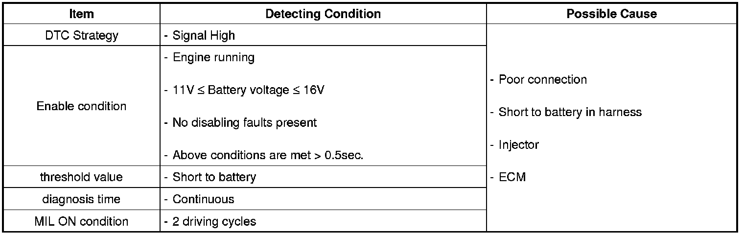 Checking output signals from injectors under detecting condition, if an output signal is high, ECM sets P0268. MIL (Malfunction Indication Lamp) turns on when the malfunction lasts till continuous 2 driving cycle.