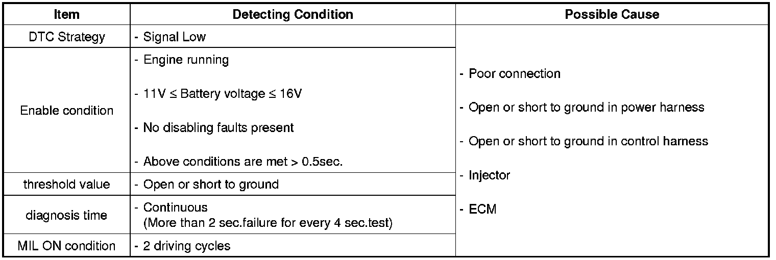Checking output signals from injectors under detecting condition, if an output signal is low, ECM sets P0270. MIL(Malfunction Indication Lamp) turns on when the malfunction lasts till consecutive 2 driving cycle.