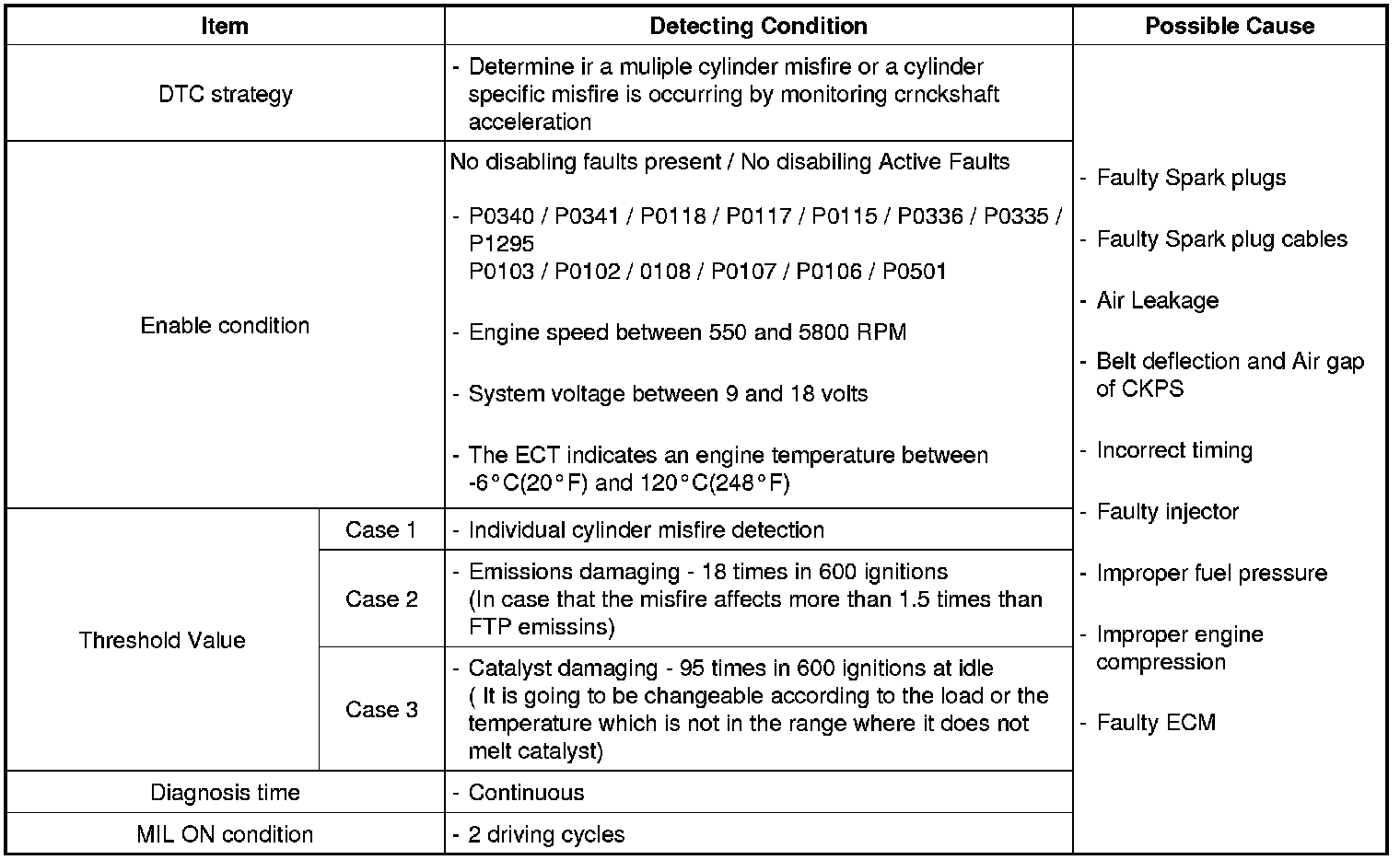 The ECM measures reference event times and calculates the positive and negative acceleration of the crank wheel to determine whether a misfire has occurred.When the rate of misfire exceeds a threshold where the catalyst reaches a temperature where permanent damage can occur, to the point that tail pipe emissions reach 1.5 times the tailpipe standard or where a cylinder misfire cause a loss of torque produced from that cylinder. ECM sets this DTC. In case that misfire affects Catalyst damage, MIL(Malfunction Indicator Lamp) will be illuminating and blinking at 1HZ frequency. However, In case of Individual and Emission damaging misfire, MIL will be turned on when the malfunction is detected.