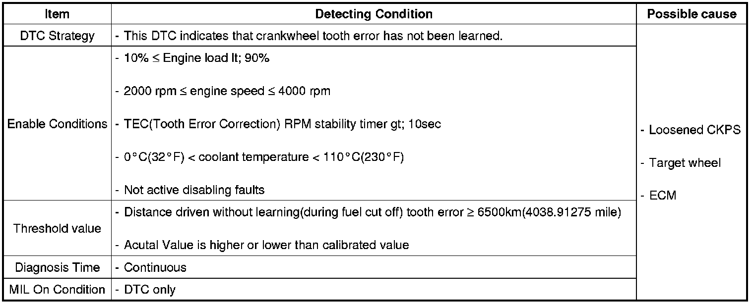 Checking tooth error correction under detecting condition, if the TEC(Tooth Error Correction) is out of Threshold value, ECM sets P0315.
