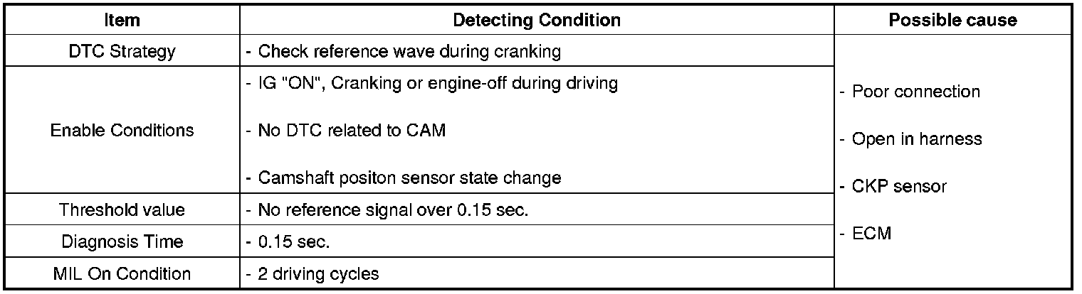 Checking reference signals from CKPS under detecting condition, if any signal is not detected for more than 0.15 sec., ECM sets P0335. MIL(Malfunction Indication Lamp) turns on when the malfunction lasts till consecutive 2 driving cycle.