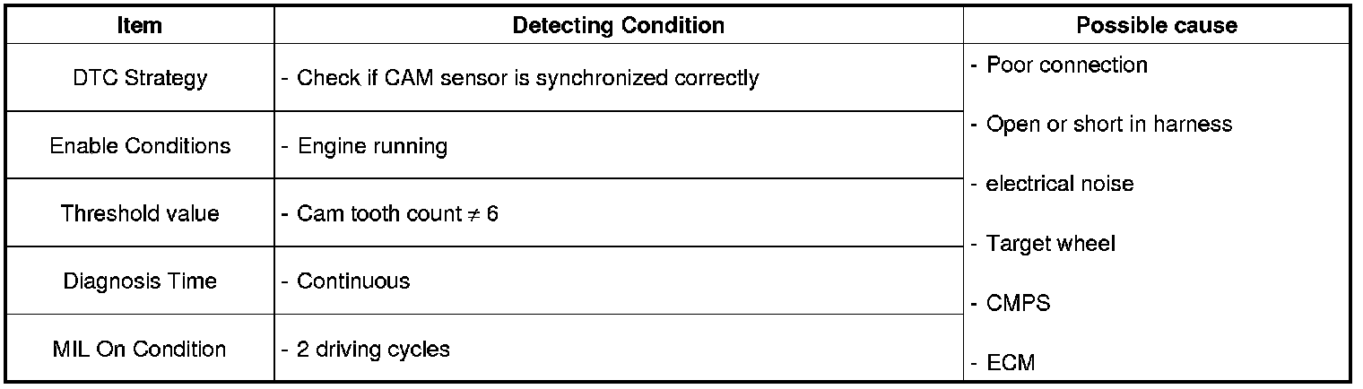 Checking output signals from CMP during engine running, if the expected number of cam tooth count is not observed, ECM sets P0346. MIL(Malfunction Indication Lamp) turns on when the malfunction lasts till consecutive 2 driving cycle.