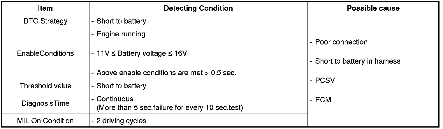 Checking output signals from PCSV every 10 sec. under detecting condition, if signals indicating short to battery in the circuit are detected for more than 5 sec., ECM sets P0445. MIL(Malfunction Indication Lamp) turns on when the malfunction lasts till consecutive 2 driving cycle.
