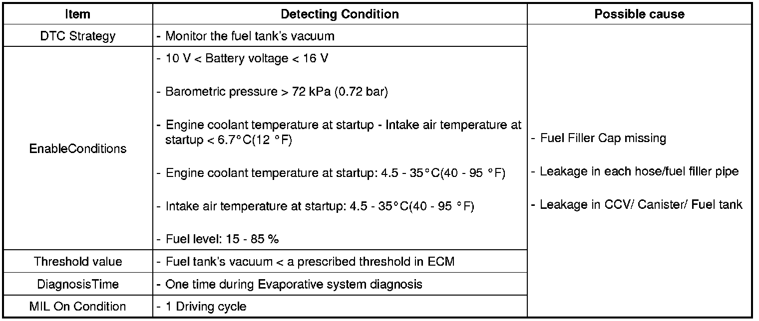 Checking output signals from fuel tank pressure sensor under evap.system test, if fuel tank's vacuum is lower than prescribed threshold in ECM, ECM sets P0455 and then MIL(Malfunction Indication Lamp) turns on.