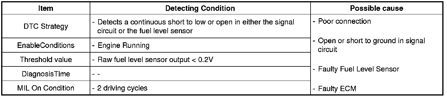 The Fuel Level Sensor(FLS) measures the fuel level in fuel tank and its information is used to supply the ECM with information regarding the monitoring condition of the EVAP canister purge system for leak detection. If the fuel level sensor is monitored for high or low stuck or difference between voltage of fuel level sensor and voltage deviation of fuel level sensor is exceeds limited value while driving, this is interpreted by the ECM as a fault