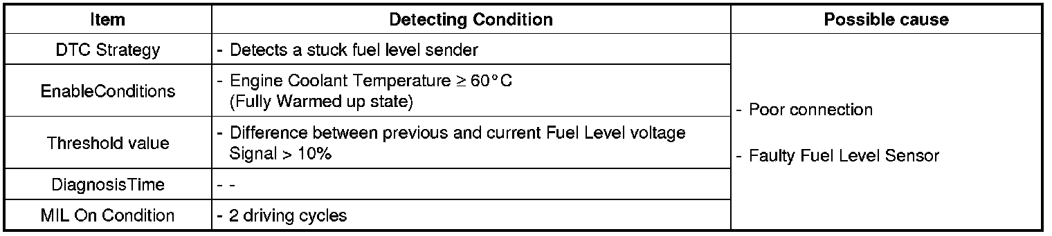 The Fuel Level Sensor(FLS) measures the fuel level in fuel tank and its information is used to supply the ECM with information regarding the monitoring condition of the EVAP canister purge system for leak detection. If the fuel level sensor is monitored for high or low stuck or difference between voltage of fuel level sensor and voltage deviation of fuel level sensor is exceeds limited value while driving, this is interpreted by the ECM as a fault