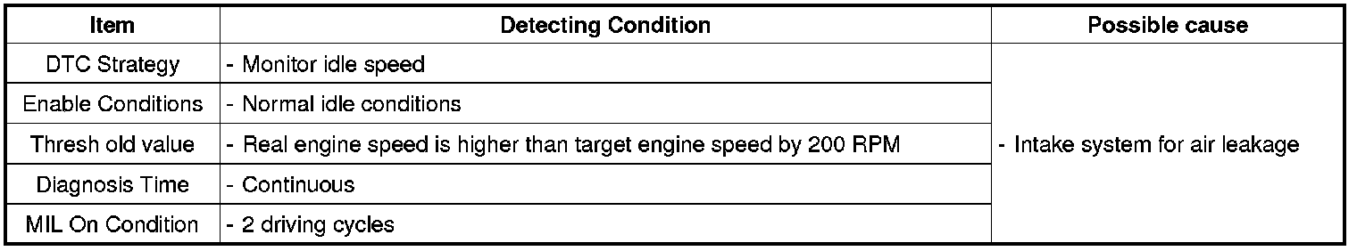 Checking idle RPM under detecting condition, if if the real idle speed is higher than desired idle speed by 200 RPM over 10 sec., ECM sets P0507. MIL(Malfunction Indication Lamp) turns on when the malfunction lasts till consecutive 2 driving cycle.