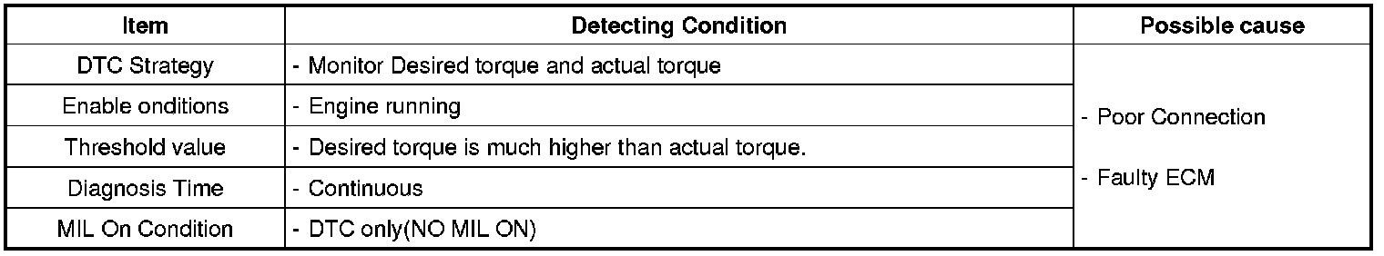 If desired torque is calculated much higher than actual torque, ECM senses it and decreases desired torque. Also, ECM sets P061B. The causes of this error are abnormal operation of ECM (RAM,ROM, ALU errors) and hardware malfunction such that actual air flow enters the engine is more than the flow recognized by ECM.
