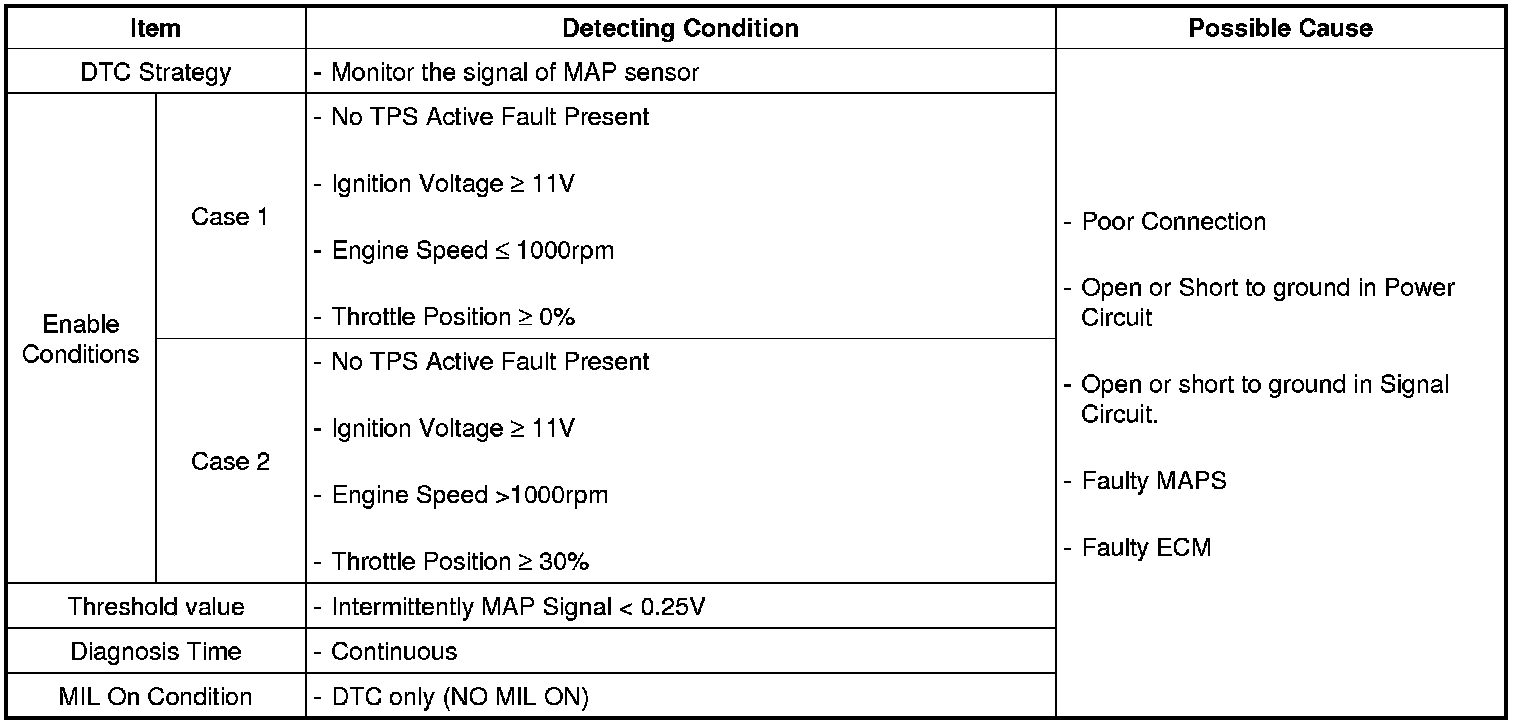 Checking output signals of MAPS under detecting condition, if an output signal is intermittently below 0.25V, ECM sets P1107.