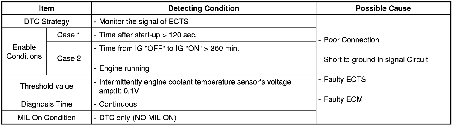 The Engine Coolant Temperature Sensor (ECTS) is located in the engine coolant passage of the cylinder head for detecting the engine coolant temperature. The ECTS uses a thermistor whose resistance changes with the temperature. The electrical resistance of the ECTS decreases as the temperature increases, and increases as the temperature decreases. The reference 5 V in the ECM is supplied to the ECTS via a resistor in the ECM. That is, the resistor in the ECM and the thermistor in the ECTS are connected in series. When the resistance value of the thermistor in the ECTS changes according to the engine coolant temperature, the output voltage also changes. During cold engine operation the ECM increases the fuel injection duration and controls the ignition timing using the information of engine coolant temperature to avoid engine stalling and improve drivability.