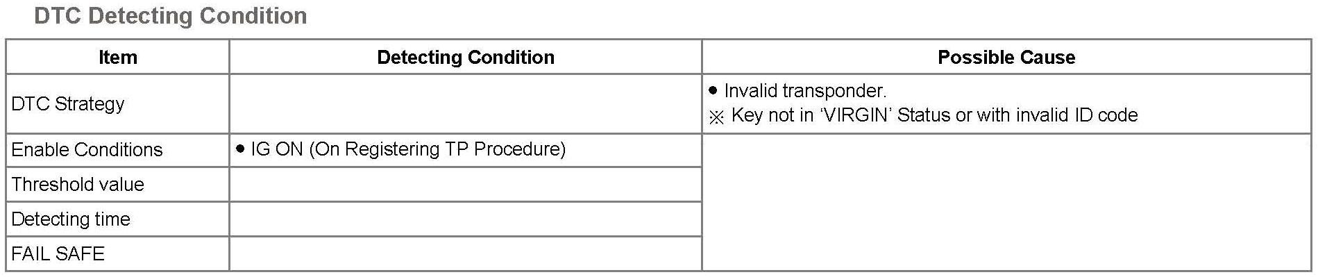 The ECM sets DTC P1674 if transponder key that can't be register (TP not in the password mode or whose transport data has been changed) is inserted for registration procedure.