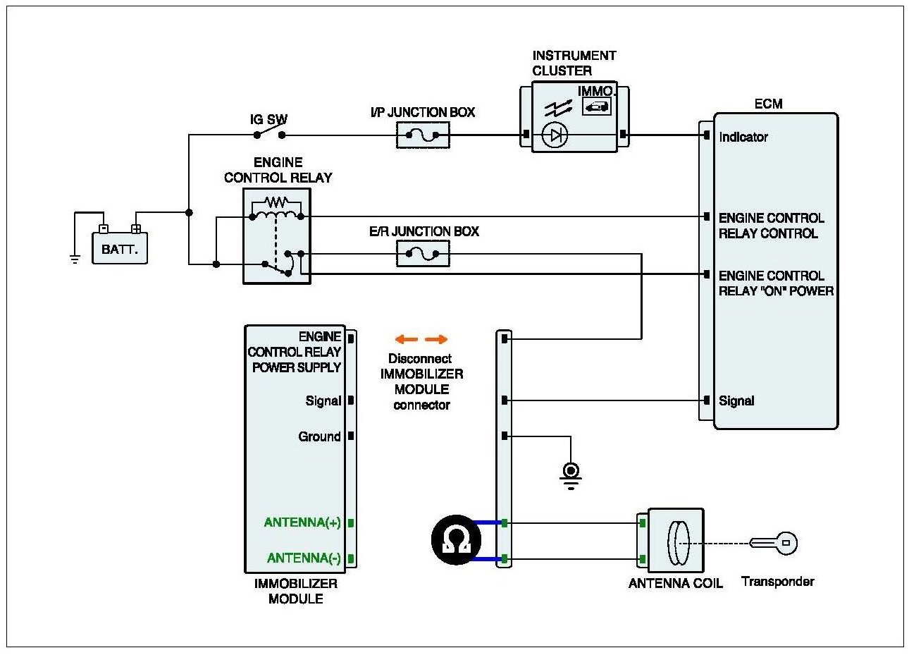 This wireless communication runs on RF (Radio frequency of 125 kHz). The antenna coil is mounted on the top of ignition lock for RF transmission and receiving. The RF signal from the transponder received by the antenna coil is converted into messages for serial communication by the SMARTRA device. And the received messages from the ECM are converted into an RF signal, which is transmitted, to the transponder by the antenna.