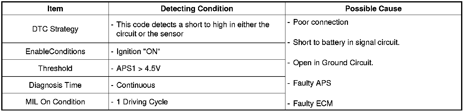 Checking output signals from APS 1, under detecting condition, if output signals are above the threshold, ECM sets P2123. MIL(Malfunction Indication Lamp) turns on.