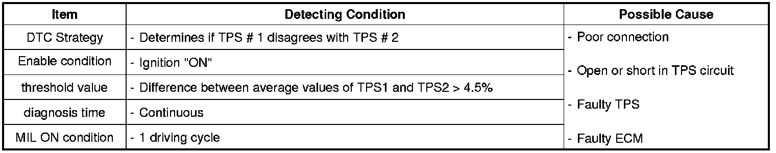 Checking output signals from TPS 1 and 2, under detecting condition, if output signals difference between TPS1 and TPS2 are detected more than 4.5% for the specified number of times., ECM sets P2135. MIL(Malfunction Indication Lamp) turns on.