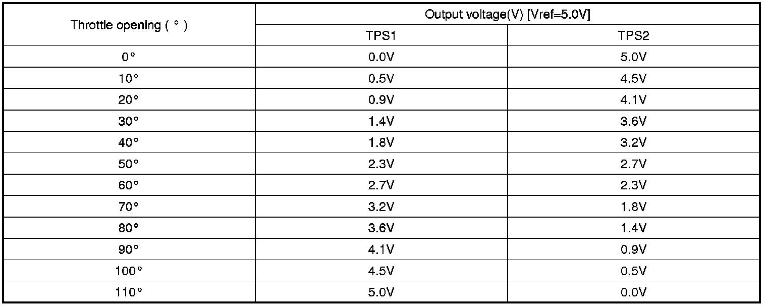 The Electronic Throttle Control(ETC) system is made of the components throttle body, Throttle Position Sensor(TPS)1&2 and Accelerator Position Sensor(APS) 1&2. TPS1&2 are sharing the same source voltage and ground.The throttle valve opening is control by throttle motor which is controlled by Engine Control Module(ECM).The opposite position indicator shows inverted signal characteristics.TPS1 output voltage increases smoothly in proportion with the throttle valve opening angle after starting. TPS2 output voltage decreases in inverse proportion with the throttle valve opening angle after starting. TPS provides feedback to the ECM to control the throttle motor in order to control the throttle valve opening angle properly in response to the driving condition.
