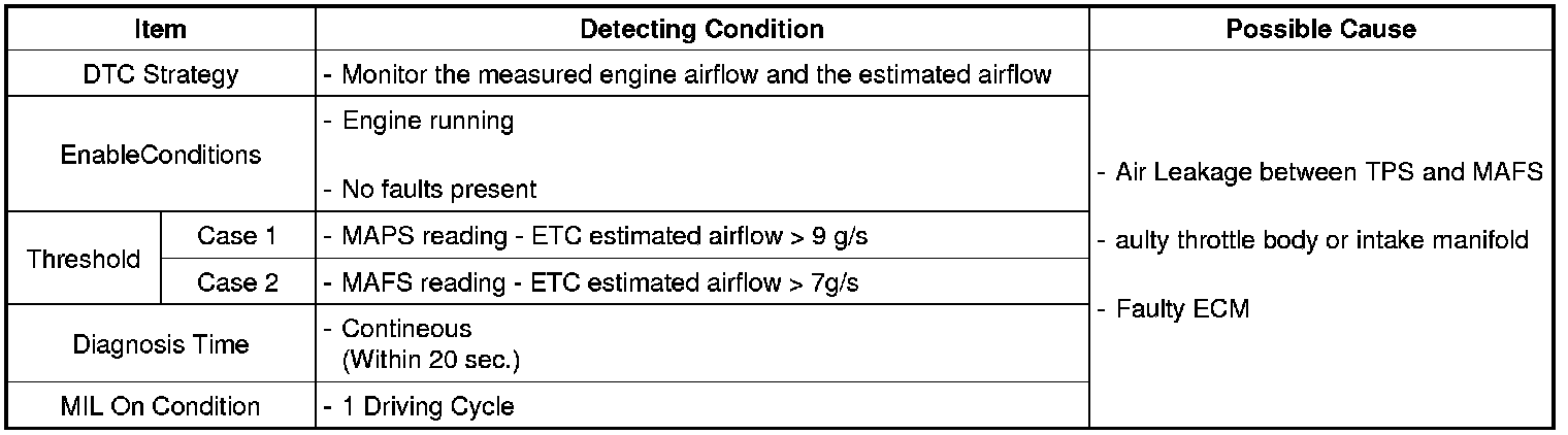 Comparing real intake air flow and the intake air flow calculated by ETS under detecting condition, if the air flow more than threshold value is detected for more than 19 sec., ECM sets P2173. And then MIL(Malfunction Indication Lamp) turns on.
