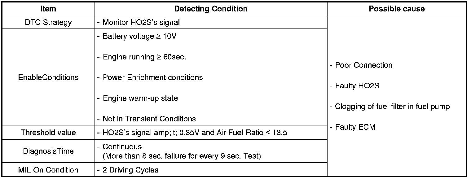 Checking output signals from HO2S under detecting condition, if HO2S's signal is lean during power enrichment conditions, ECM sets P2195. MIL(Malfunction Indication Lamp) turns on when the malfunction lasts till consecutive 2 driving cycle.