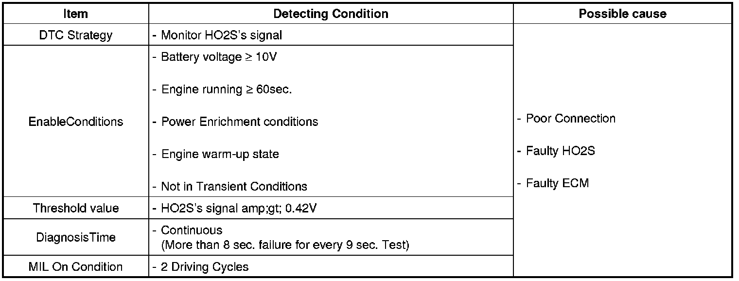 Checking output signals from HO2S under detecting condition, if HO2S's signal is rich during fuel cut-off conditions, ECM sets P2196. MIL(Malfunction Indication Lamp) turns on when the malfunction lasts till consecutive 2 driving cycle.