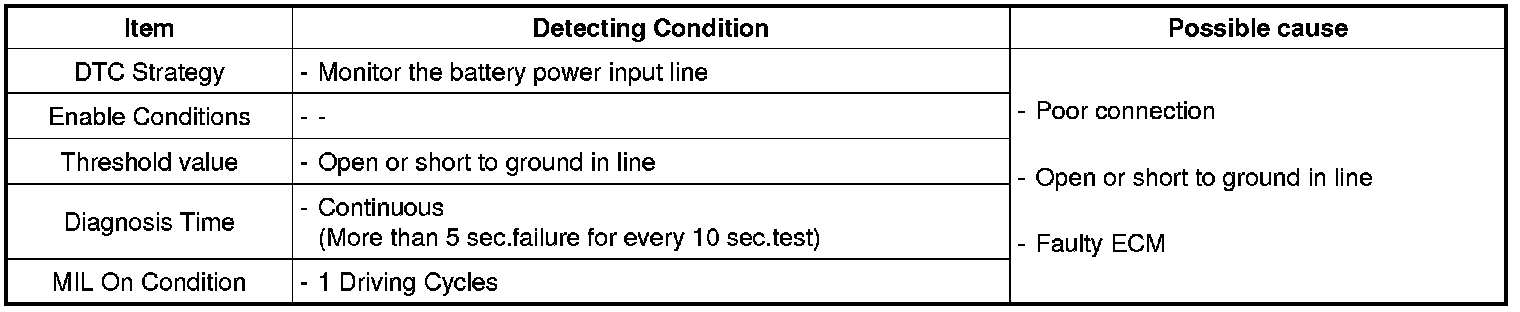 If the battery power input line has a problem, ECM sets P2507 and MIL(Malfunction Indication Lamp) turns on.