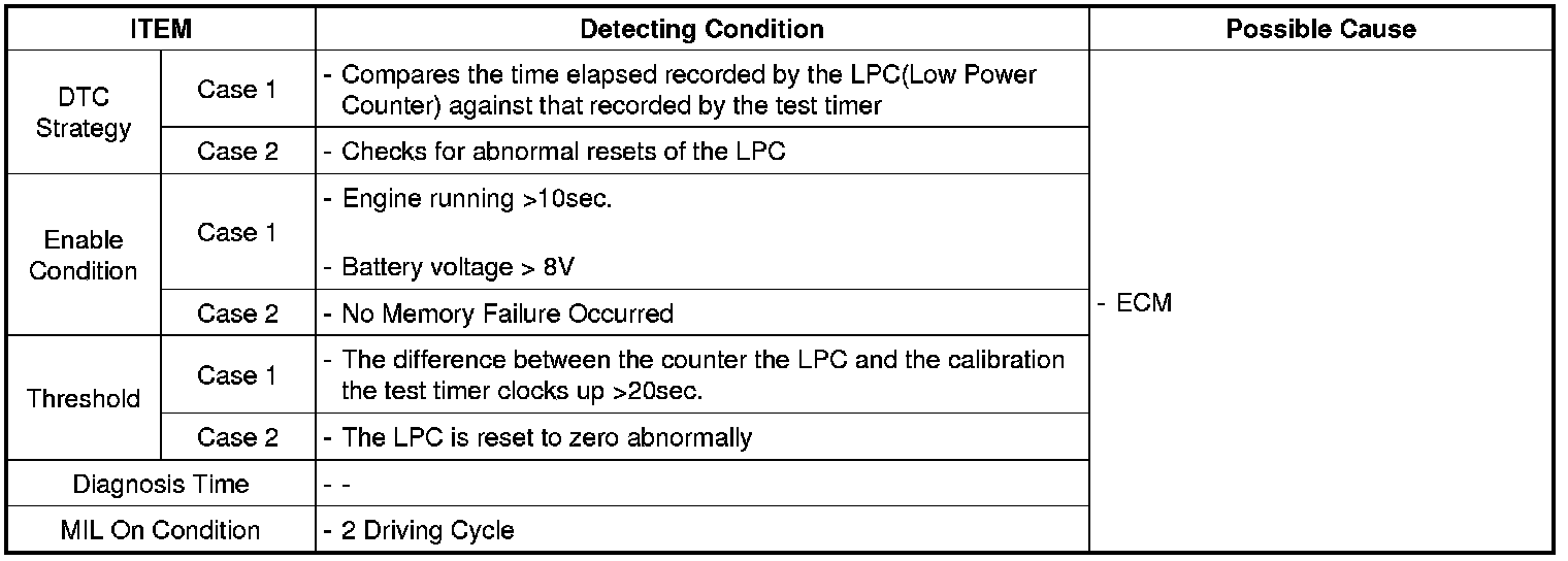 If abnormal counterdown is detected for a calibratable time, ECM sets P2610. MIL(Malfunction Indication Lamp) turns on when the malfunction lasts till consecutive 2 driving cycle.