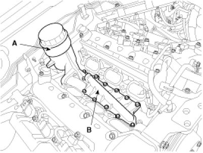 2. Install oil filter body cover(B) and new gasket on the oil filter body(A).