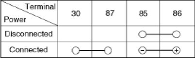 2. There should be continuity between the No.86 and No.85 terminals when power and ground are connected to the No.87 and No.30 terminals.