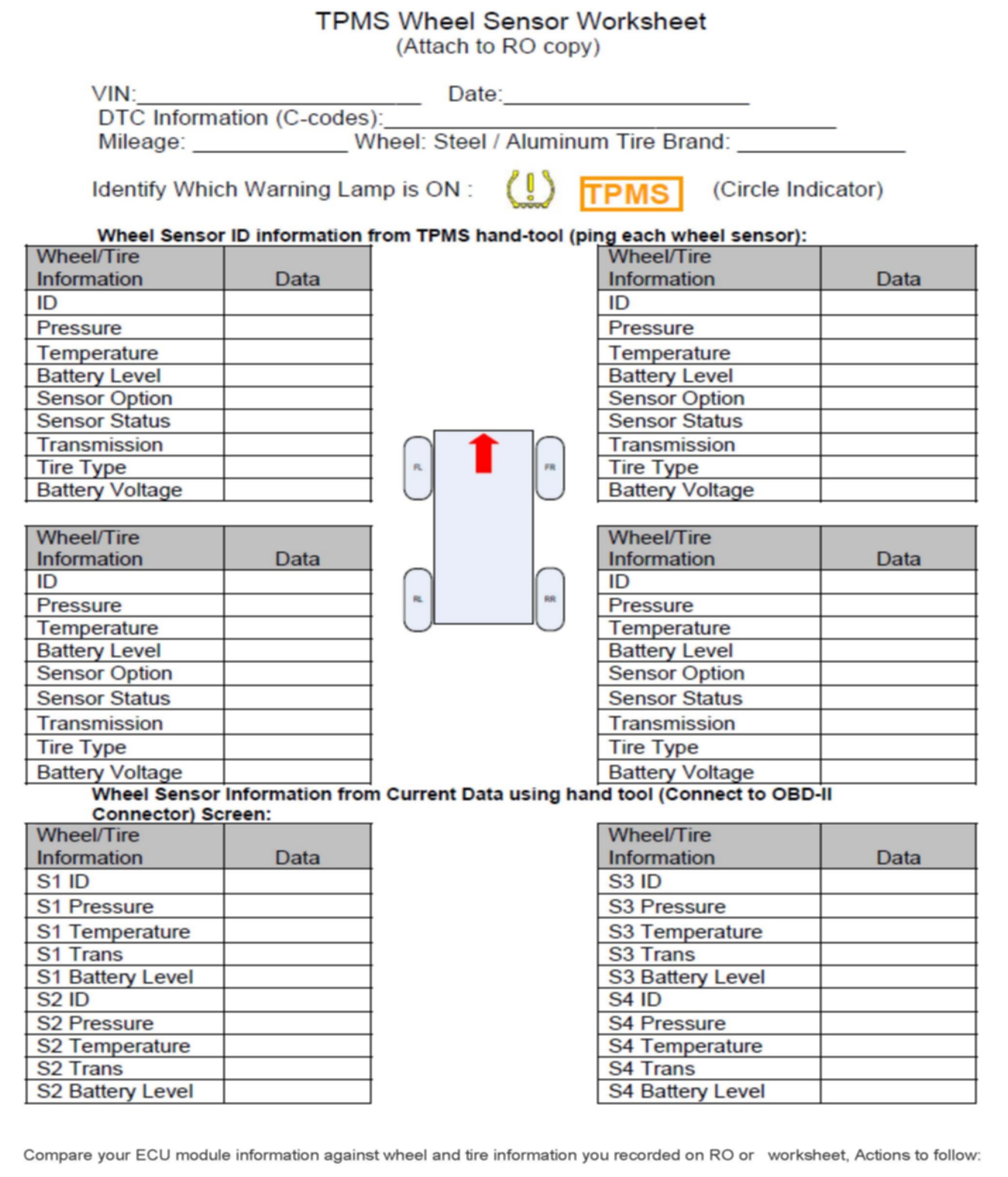 ^ Match wheel sensor ID, against the ID recorded from the exciter tool/ECU. The missing sensor ID should be checked for correct setting and battery level, replace sensor if necessary.