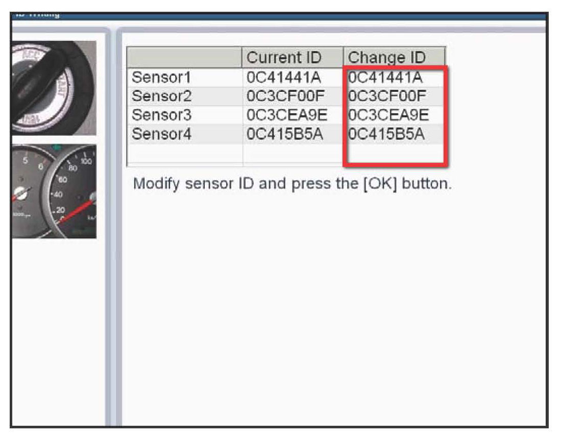 Input the TPMS sensor ID correctly for each location as shown in this screen image. The ID of the TPMS sensor consists of 8 alphanumeric digits (numbers and letters).