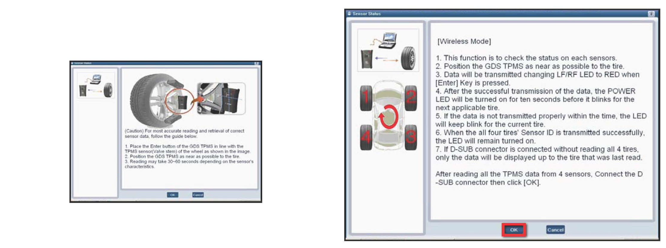 1. After following the procedure displayed on the screen, press the "OK" button. The ODS will communicate wi4h the GDS TPMS Module through the D-Sub Cable P/No: G1PDDGA004