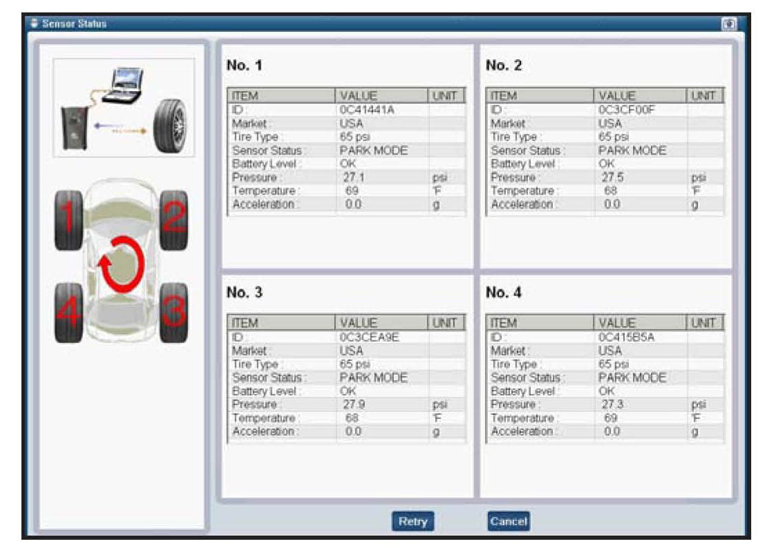 ^ Results are displayed in the Sensor Status Display box in the order of the sensors as measured by GDS TPMS (left front, right front, right rear, left rear).