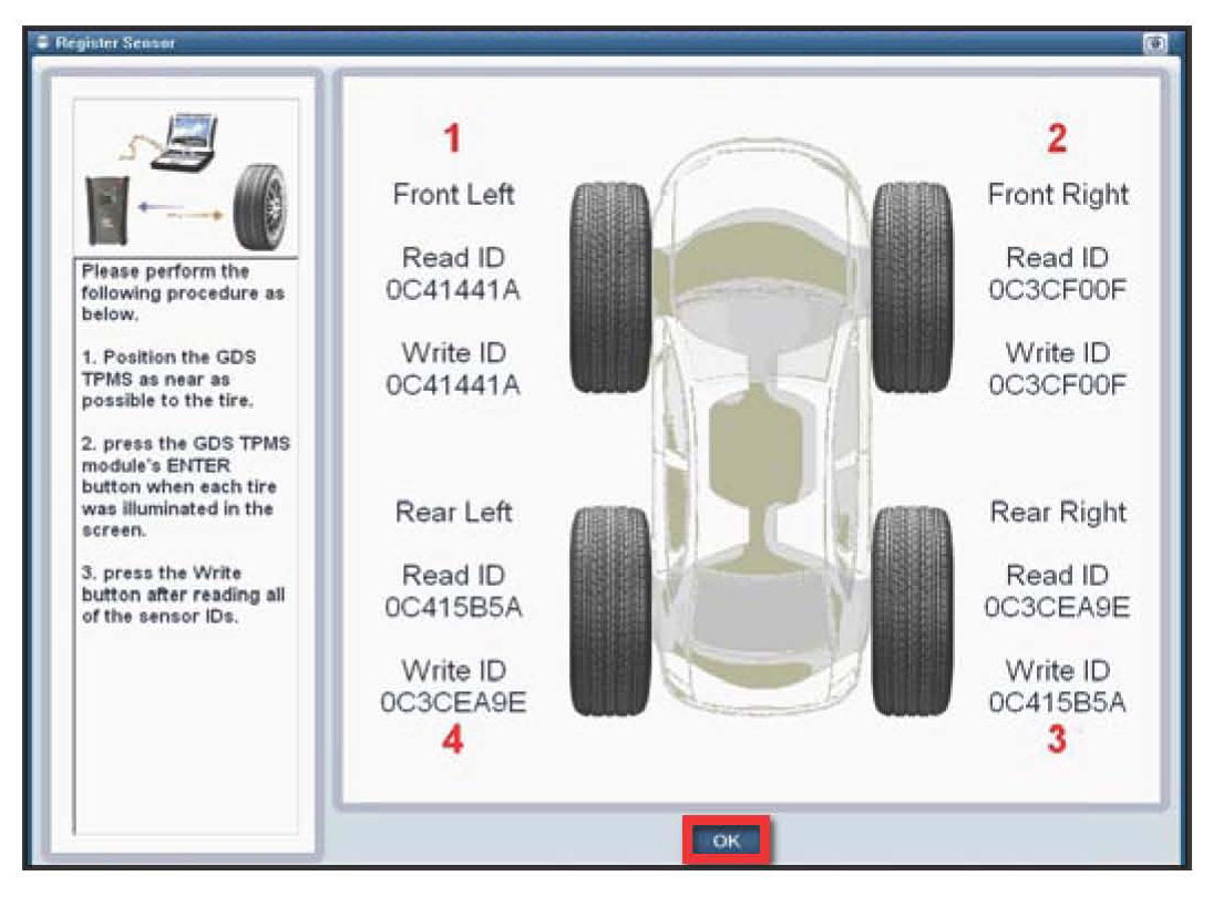 ^ After inputting the final TPMS sensor ID, press "OK" button on the bottom of the screen to save the TPMS sensor ID.