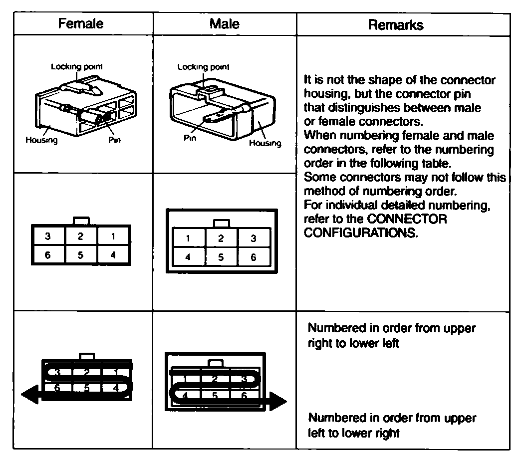 - The "Connector Configurations" section identifies connectors that are used to join harnesses together; junction connectors for common power and ground wires are also identified in this section. Male and female connector views are shown applicable.