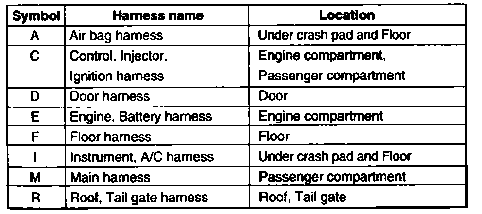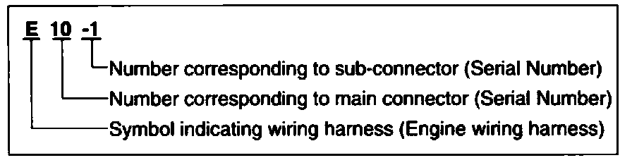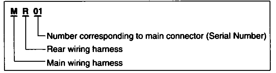 A connector identification symbol consists of a wiring harness location classification symbol corresponding to a wiring harness location and number corresponding to the connector.