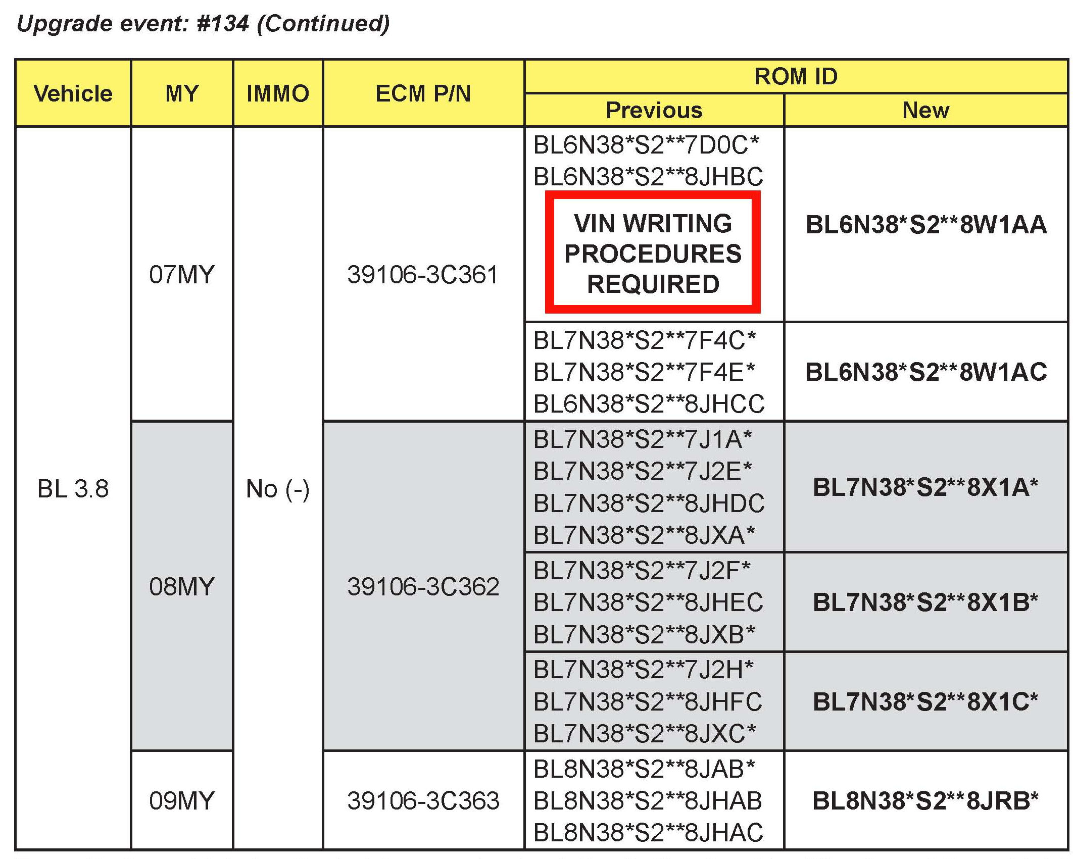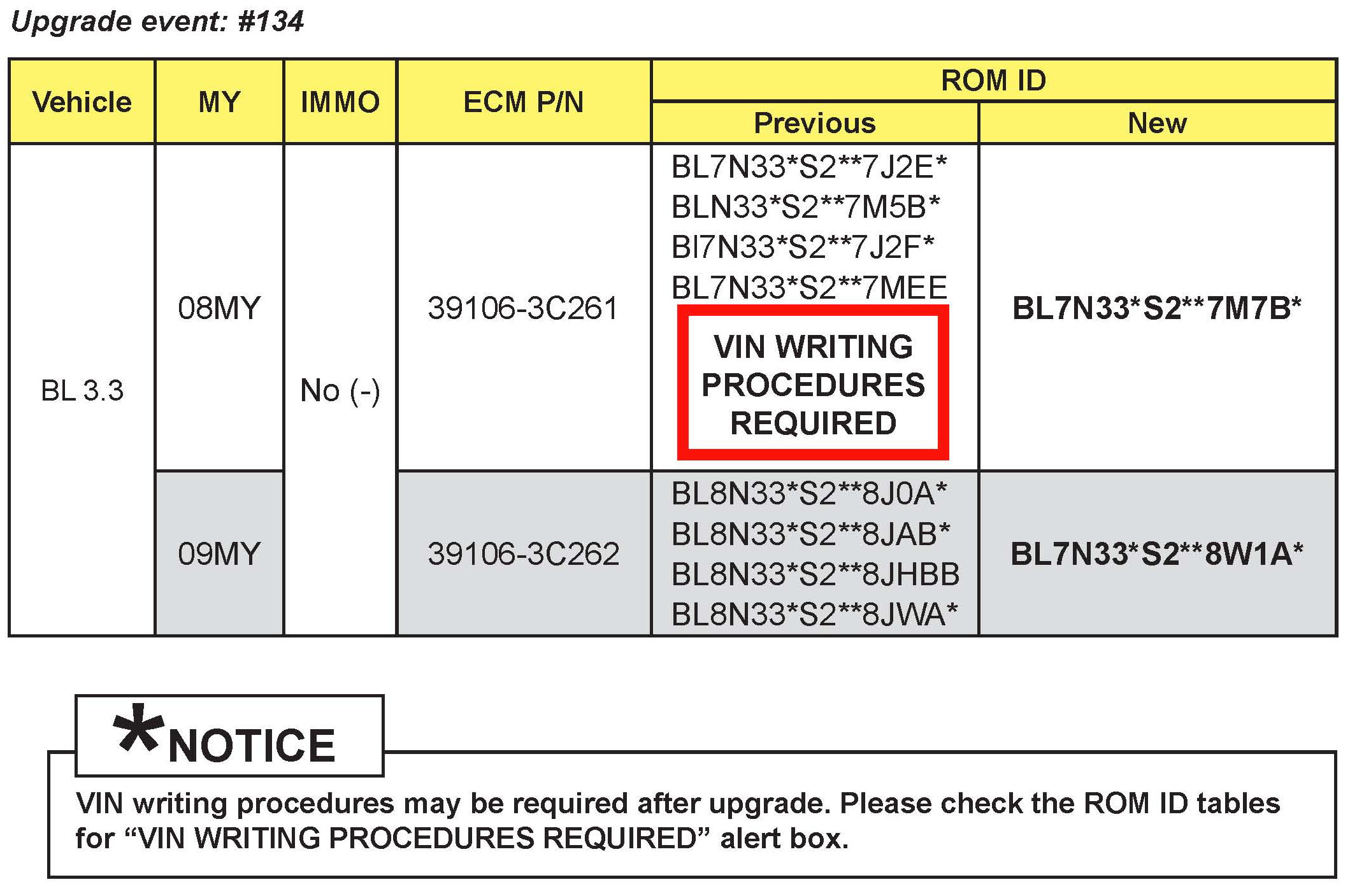 This bulletin provides the procedure to upgrade the Engine Control Module (ECM) on some 2007-2009MY Sorento (BL) 33/38L vehicles which may experience idle irregularity with brake pedal applied/depressed. This software upgrade will improve idle RPM Make certain VIN writing procedure is performed on certain ROM IDs as indicated on the ROM chart.