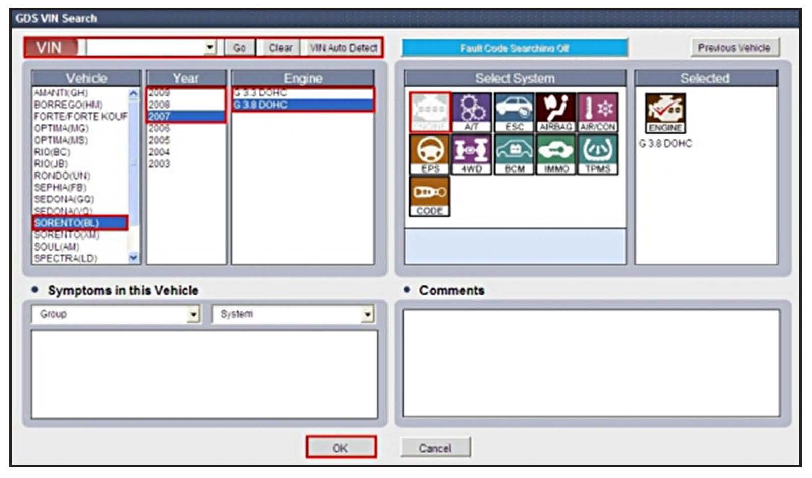 Enter the vehicle information by pressing the VIN Auto Detect button, entering the vehicle's VIN or selecting the vehicle model, model year, engine/fuel type and ENGINE as the system; then click OK.